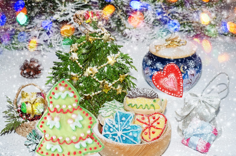 Пряники и печенье на красочном рождественском фоне