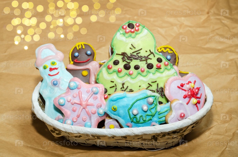 Красочные рождественские пряники в корзине. Выпечка к зимним праздникам