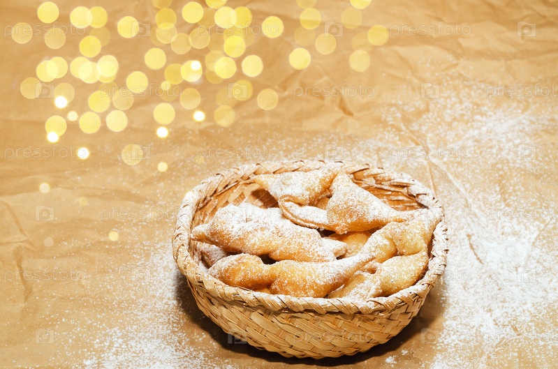 Печенье хворост, посыпанное сахарной пудрой, лежит в корзине на скомканной бумаге