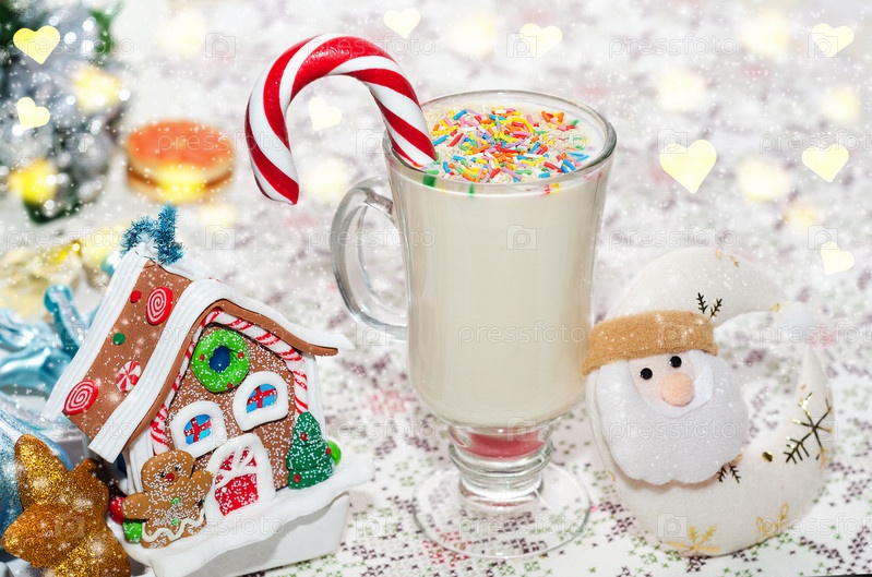Молочный коктейль с карамельной тростью для зимних праздников среди рождественских украшений