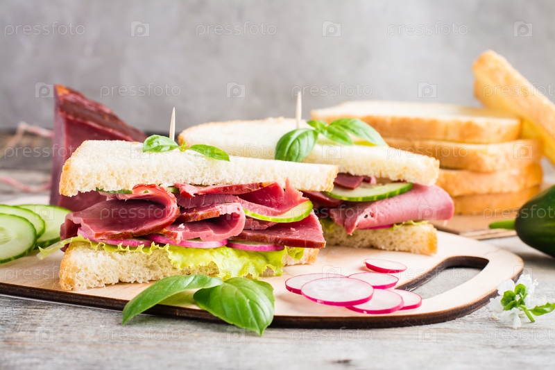 Свежие бутерброды с пастрами, огурцом и редисом на разделочной доске. Американская закуска. Деревенский стиль