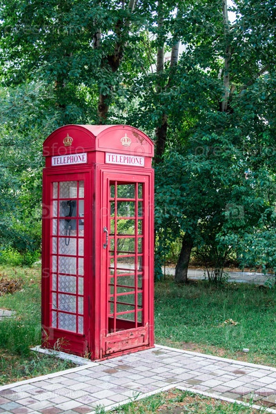 Старая винтажная красная таксофонная будка на тротуаре на улице. Устаревшие коммуникации