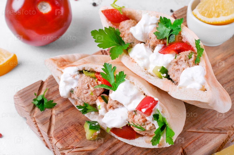 Карман из лаваша с начинкой из фрикаделек и овощей со сметаной и кинзой. блюда арабской, турецкой и греческой кухонь