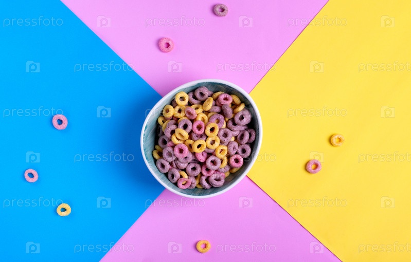 Разноцветные фруктовые петли с натуральными красителями в керамической миске на геометрическом фоне. Хлопья на завтрак