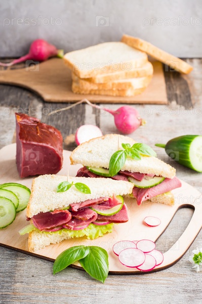 Свежие бутерброды с пастрами и овощами на разделочной доске. Американская закуска. Деревенский стиль. Вертикальный вид