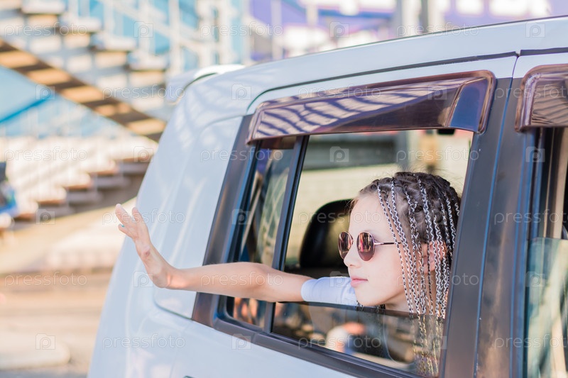 Симпатичная девочка-подросток в солнцезащитных очках с афрокосичками машет рукой из окна, сидя в машине. Дорожное путешествие