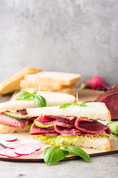 Свежие бутерброды с пастрами, огурцом и редисом на разделочной доске. Американская закуска. Деревенский стиль. Вертикальный вид