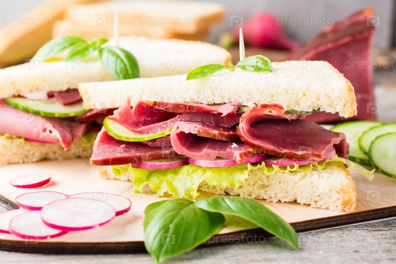 Свежие бутерброды с пастрами, огурцом, редисом и базиликом на разделочной доске. Американская закуска. Деревенский стиль. Крупный план