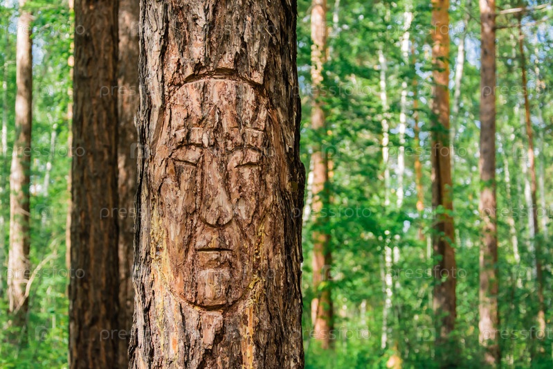 Вырезанное лицо на коре сосны в сибирском хвойном лесу. Жизнь древних людей