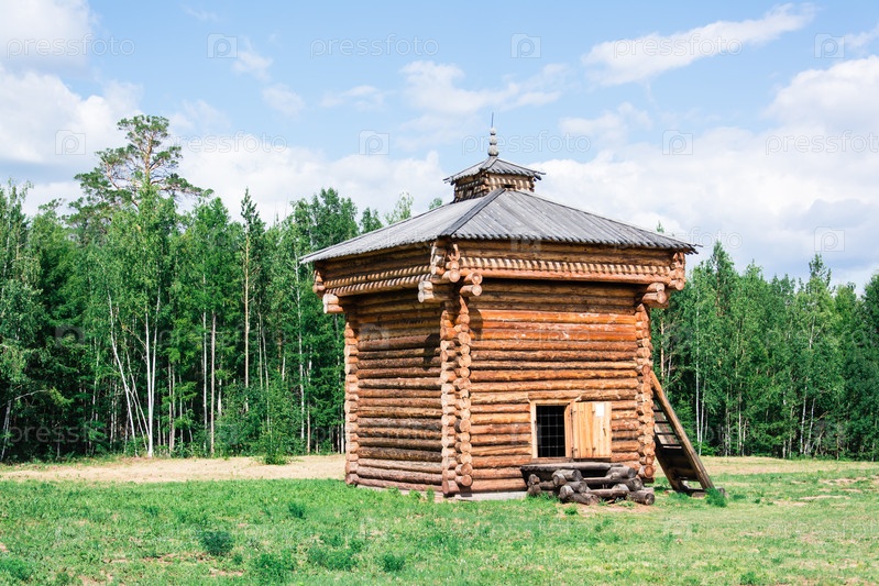 Древняя деревянная тюрьма на лесной поляне в Сибири. Историческая жизнь