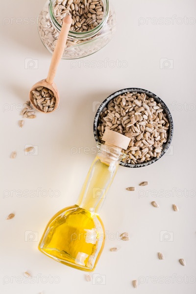 Подсолнечное масло в бутылке и семечки в миске на столе. Здоровая пища. Сверху и по вертикали