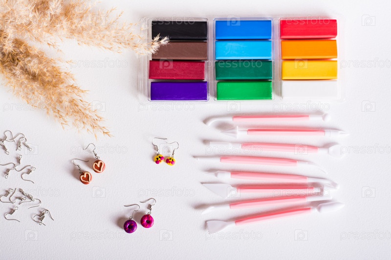 Разноцветная полимерная глина и инструменты для изготовления серег. Вид сверху