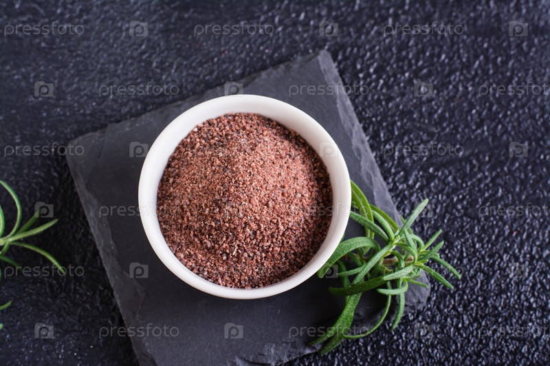 Черная гималайская каменная соль в миске и розмарин на черном фоне. Вид сверху. Крупный план