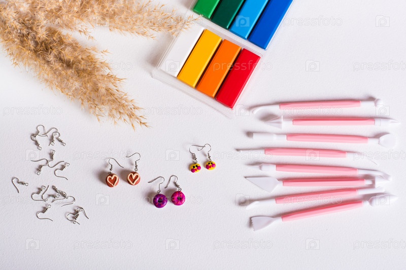 Готовые серьги из полимерной глины и инструменты для работы. Ручная работа и отдых. Вид сверху
