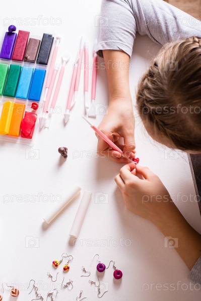 Детские ручки делают деталь для мишки из полимерной глины. Ручная работа и отдых. Вид сверху