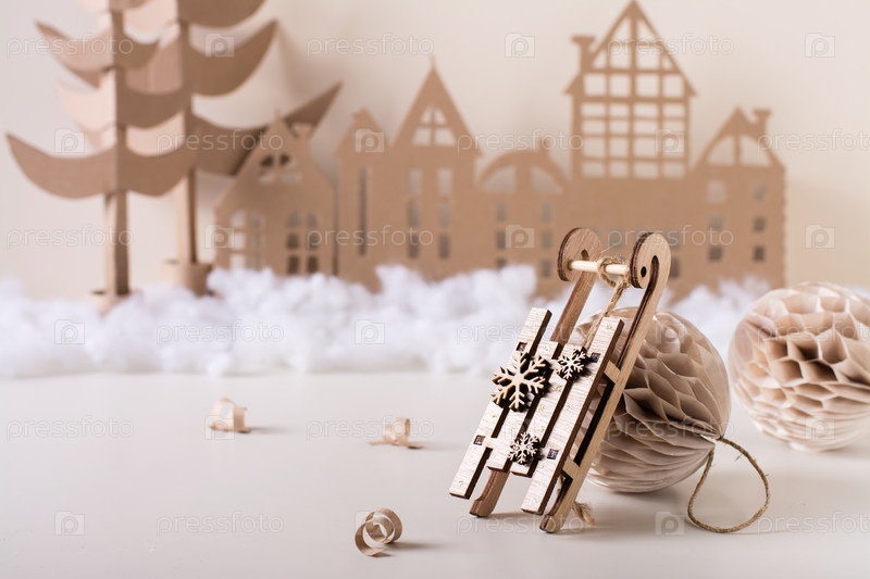 Новогодний декор для дома своими руками - деревянные санки из бумажных шариков, картонная елка и домик. Ручной работы