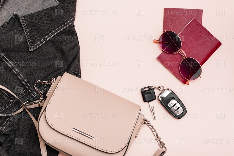 Подготовка к автопутешествию. Паспорта, солнцезащитные очки, ключи от машины, сумка и джинсовая куртка на розовом фоне. Местный туризм. Вид сверху
