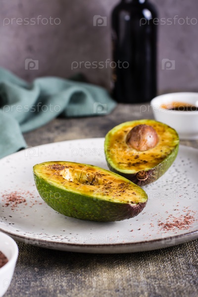 Авокадо с черной солью кала намак на тарелке на столе. Вертикальный вид