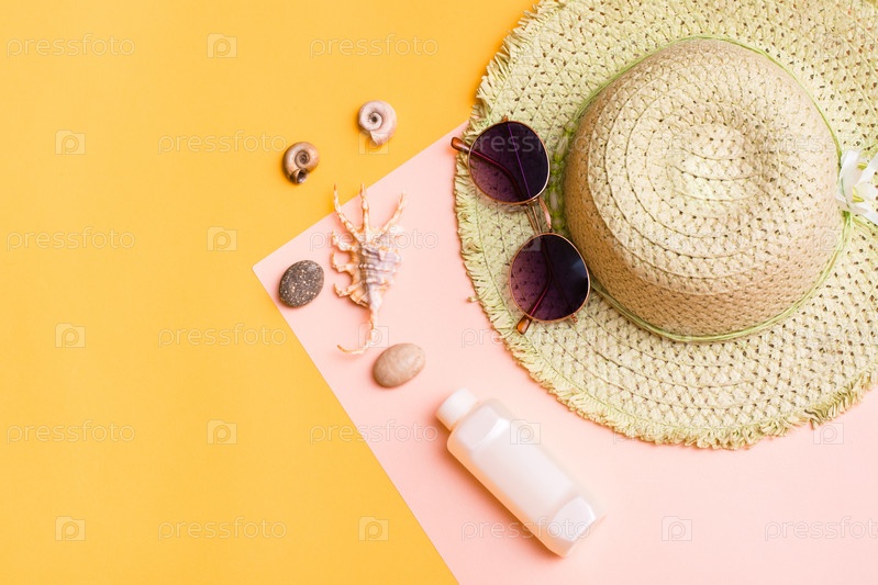 Пляжный отдых. Соломенная шляпа, солнцезащитные очки, бутылка солнцезащитного крема и ракушки на желто-розовом картоне. Товары для принятия солнечных ванн и загара. Вид сверху