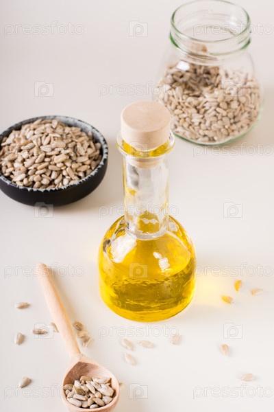 Подсолнечное масло в бутылке и семечки в миске на столе. Здоровая пища. Вертикальный вид