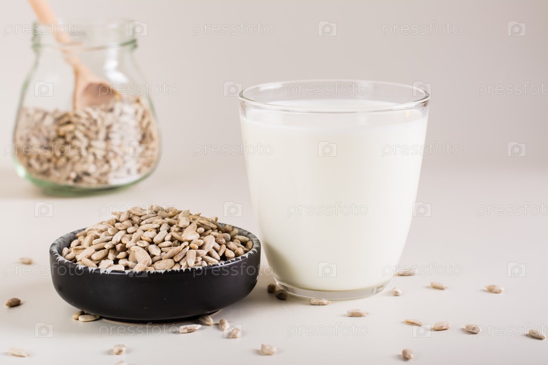 Органическое подсолнечное молоко в стакане и семена в миске на столе. Безмолочная альтернатива