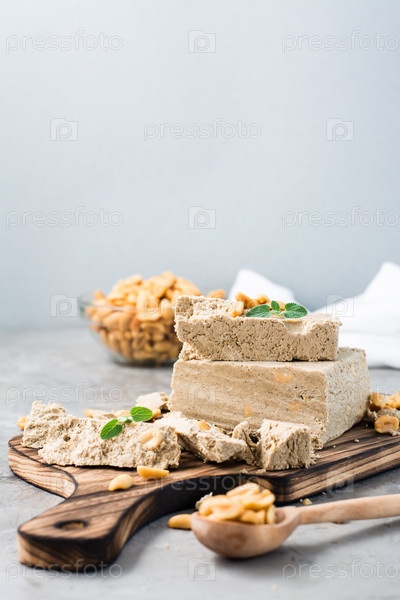 Кусочки подсолнечной и арахисовой халвы и листьев мяты на разделочной доске на столе. Калорийный восточный десерт. Вертикальный вид