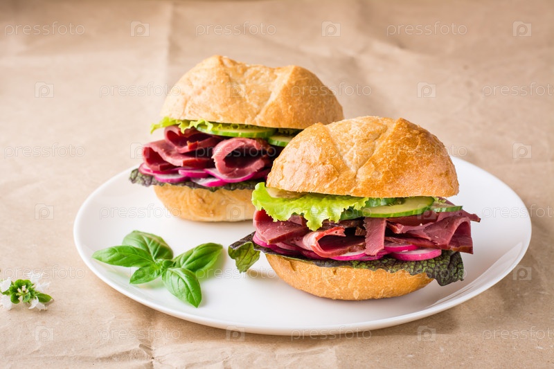 Готовые к употреблению гамбургеры с пастрами, овощами и базиликом на тарелке на крафт-бумаге. Американский фаст-фуд