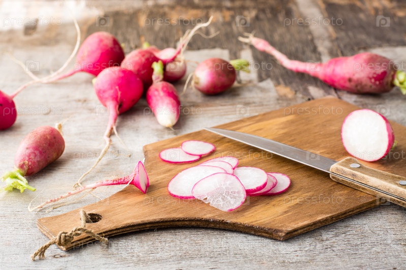 Свежий нарезанный редис и нож на разделочной доске на деревянном столе. Овощи для вегетарианской диеты. Деревенский стиль