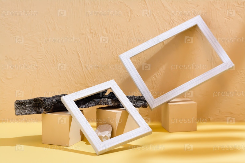 Современный абстрактный фон образа жизни: бетон, пустые фоторамки, камни и кора дерева в тени листьев. Место для текста