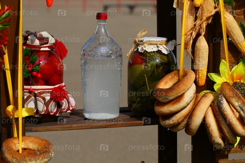 Соленые огурцы и помидоры с самогоном в деревенском декоре