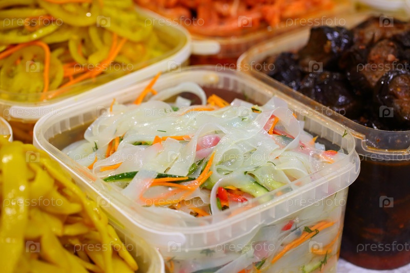 Корейские соленья на прилавке магазина