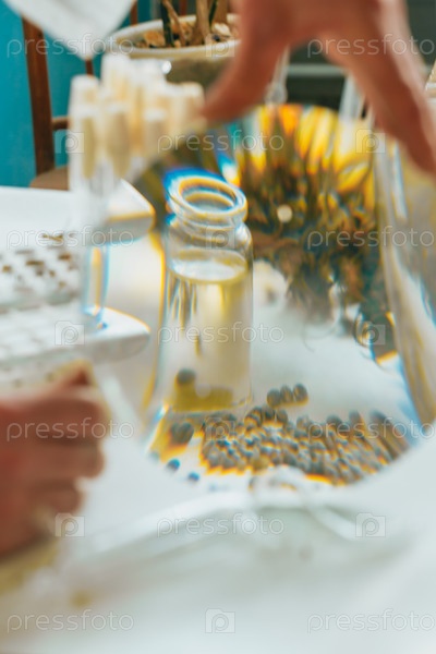 Масло из конопли CBD, ученый держит бутылку масла каннабиса против растения марихуаны