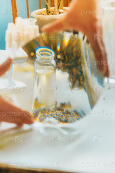 Масло из конопли CBD, ученый держит бутылку масла каннабиса против растения марихуаны