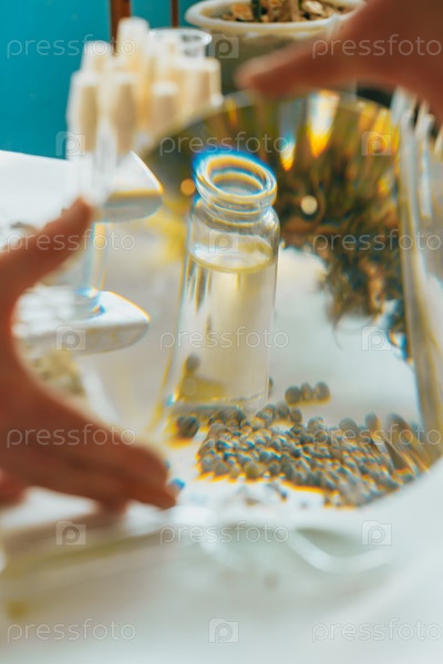 Масло из конопли CBD, ученый держит бутылку масла каннабиса против растения марихуаны