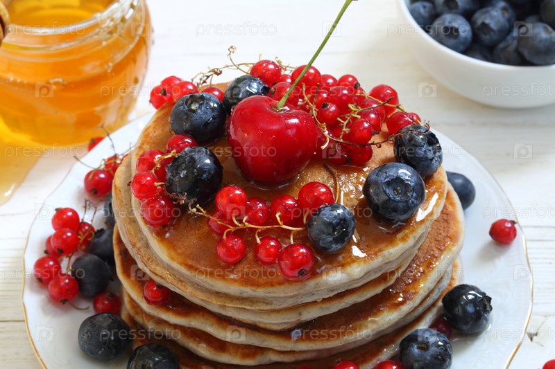 Панкейки с красной смородиной,голубикой и медом на белом фоне