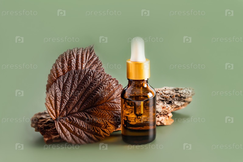 Косметический флакон с органическим продуктом или сывороткой для ухода за омолаживающей кожей лица на фоне натуральных материалов
