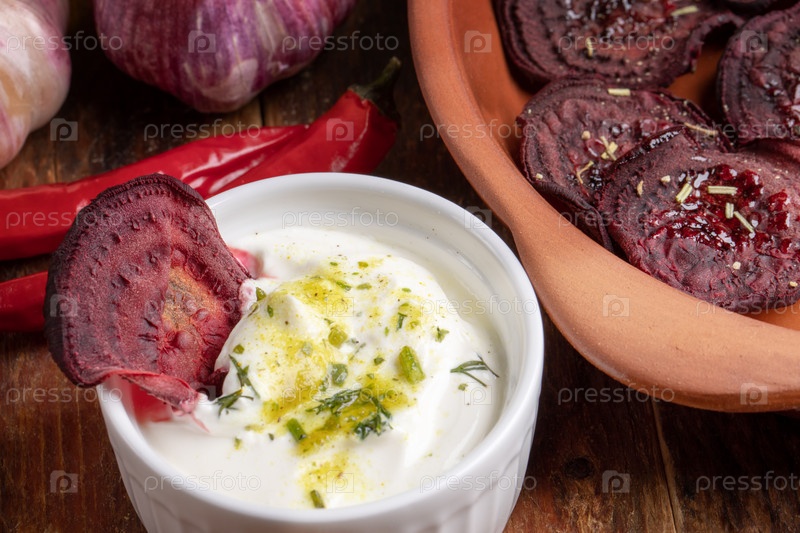 Чашки крупным планом со свекольными чипсами и сметанным соусом, чесноком и перцем на деревянном фоне