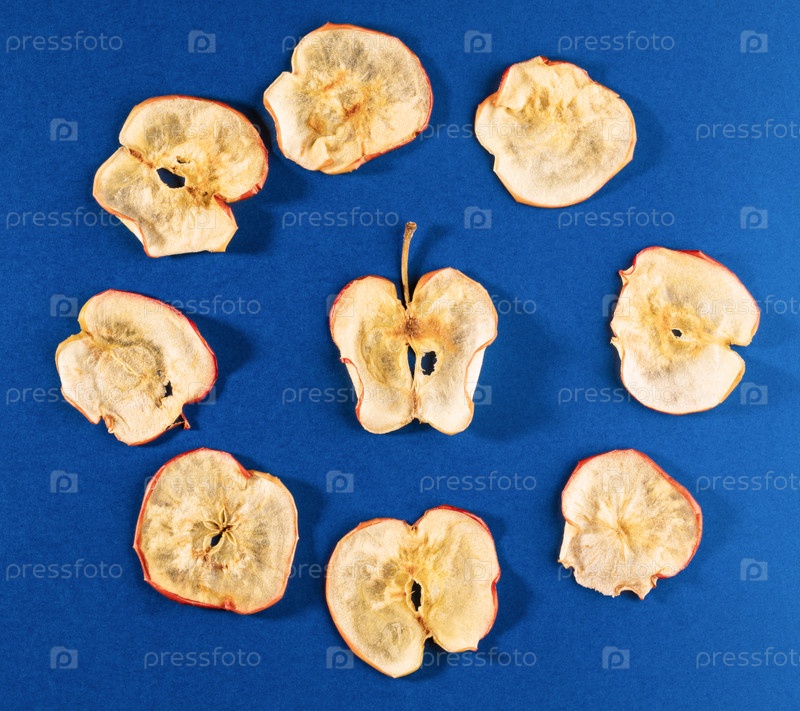Яблочные чипсы выложены по кругу на ярко-синем фоне