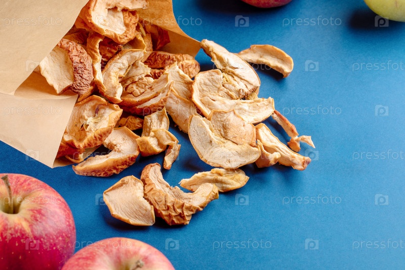 Бумажный пакет с разбросанными сушеными ломтиками яблок и целыми фруктами на синем фоне