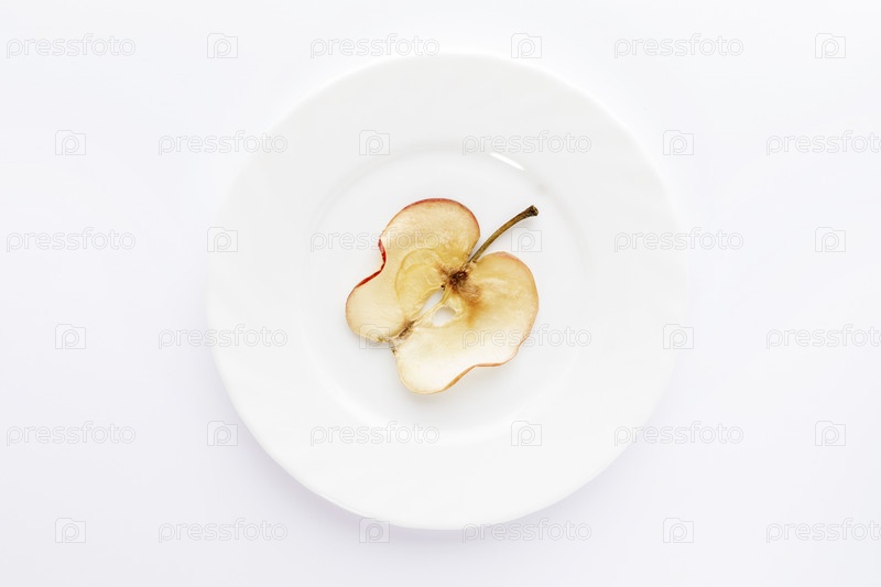 Один тонкий ломтик сушеного яблока на круглой белой тарелке на белом фоне