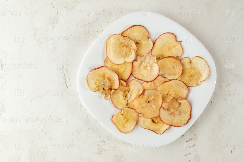 Белая квадратная тарелка с яблочными чипсами на текстурированном белом фоне