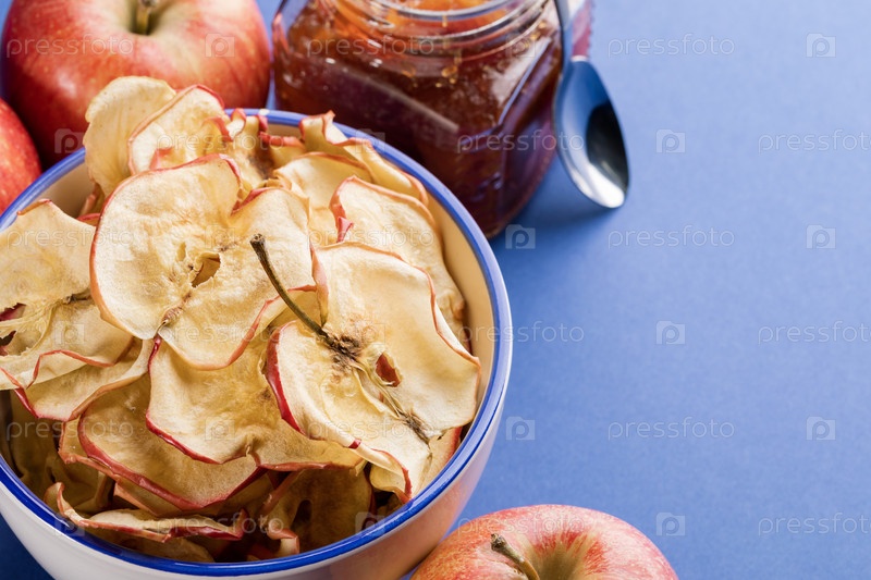 Чашка крупным планом с яблочными чипсами, свежими яблоками и банкой яблочного варенья и металлической ложкой на синем фоне