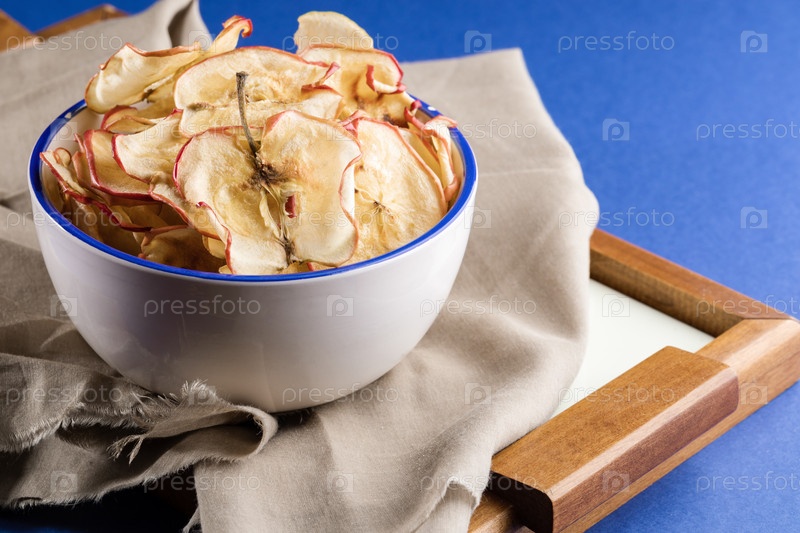 Крупным планом белая чашка со здоровыми яблочными чипсами на деревянном подносе с бежевой тканью на синем фоне