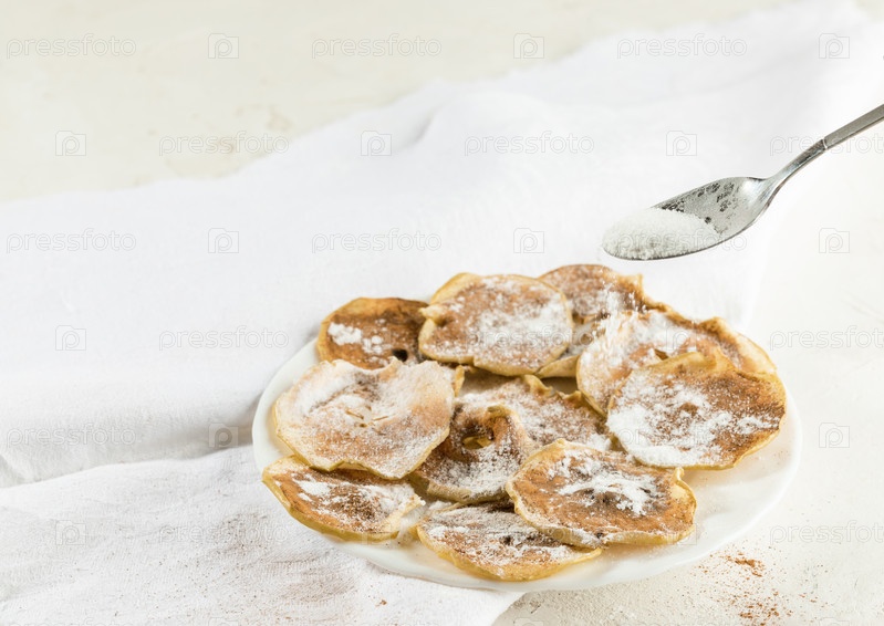 Яблочные чипсы, посыпанные корицей, посыпают сахарной пудрой из ложки