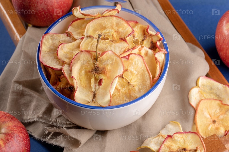 Чашка крупным планом с яблочными чипсами и свежими красными яблоками на бежевой ткани