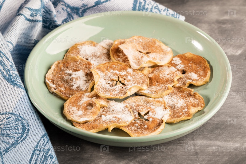 Яблочные чипсы крупным планом, посыпанные сахарной пудрой и корицей на тарелке и полотенце на сером фоне