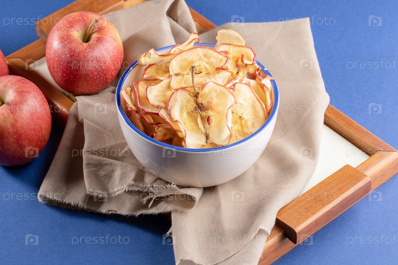 Чашка с яблочными чипсами и свежими яблоками на деревянном подносе с бежевой тканью на синем фоне