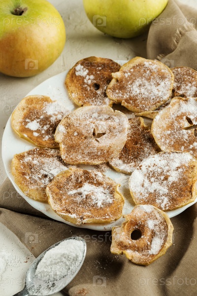 Яблочные чипсы с сахарной пудрой и корицей на бежевой ткани на фоне целых яблок