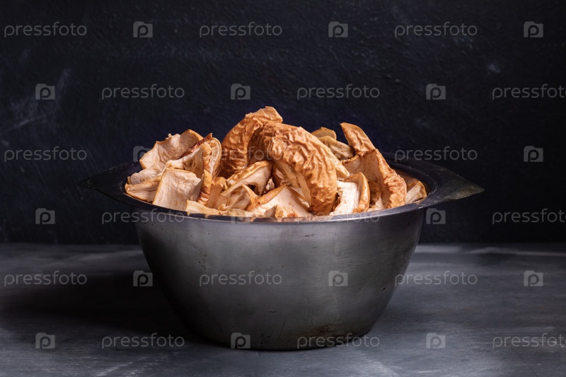 Металлическая чаша с сушеными ломтиками яблока стоит на темном фоне