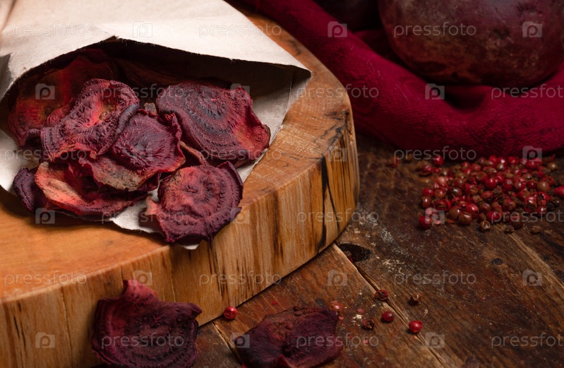 Домашние свекольные чипсы в бумажном пакете на разрезе на деревянном столе